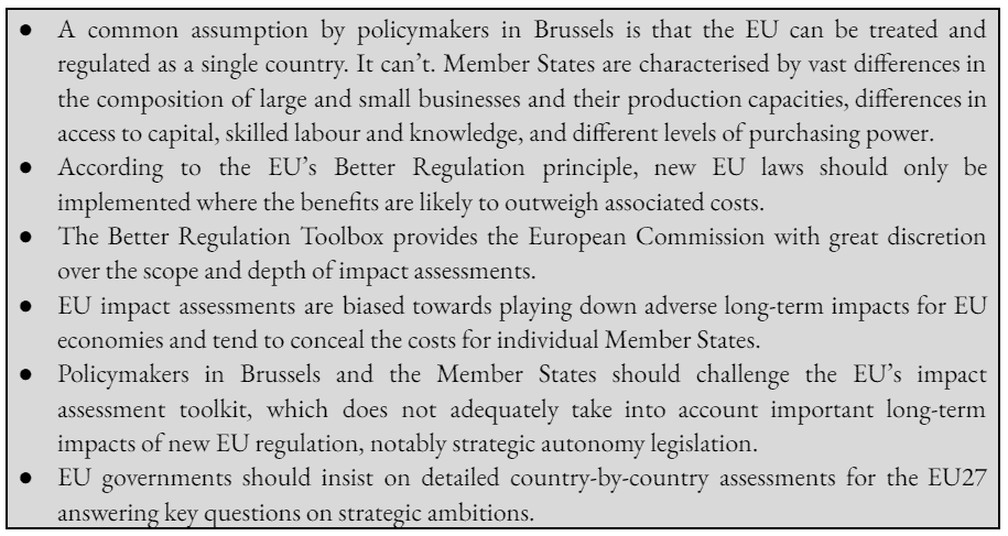 EU impact assessments so far fail to provide a prudent picture of the long-term impacts that result from new EU initiatives and regulations. Policymakers in small EU Member States should not make any far-reaching decisions based on EU impact assessment reports that ignore, obscure or downplay these impacts. They should start challenging the European Commission’s discretion over the depth and scope of regulatory impact assessments. EU governments should insist on detailed country-by-country assessments addressing key questions for long-term ambitions (see Box 3).