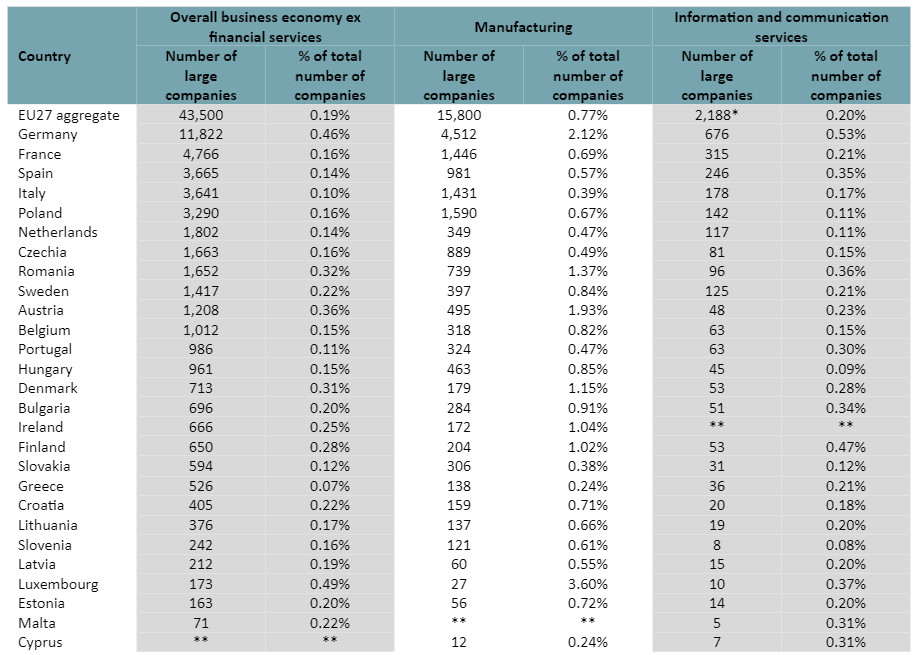 Source: Eurostat annual enterprise statistics by size class for special aggregates of activities (NACE Rev. 2). Large companies: companies with 250 persons employed or more. ** indicates data gap.