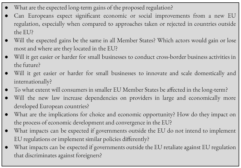Most of these impacts are – formally – accounted for by the EU’s Better Regulation Toolbox. The Toolbox provides the official methodology for assessing European Commission-initiated laws and regulations. It is meant to ensure a solid review of potential impacts of different policy options and who will be affected.