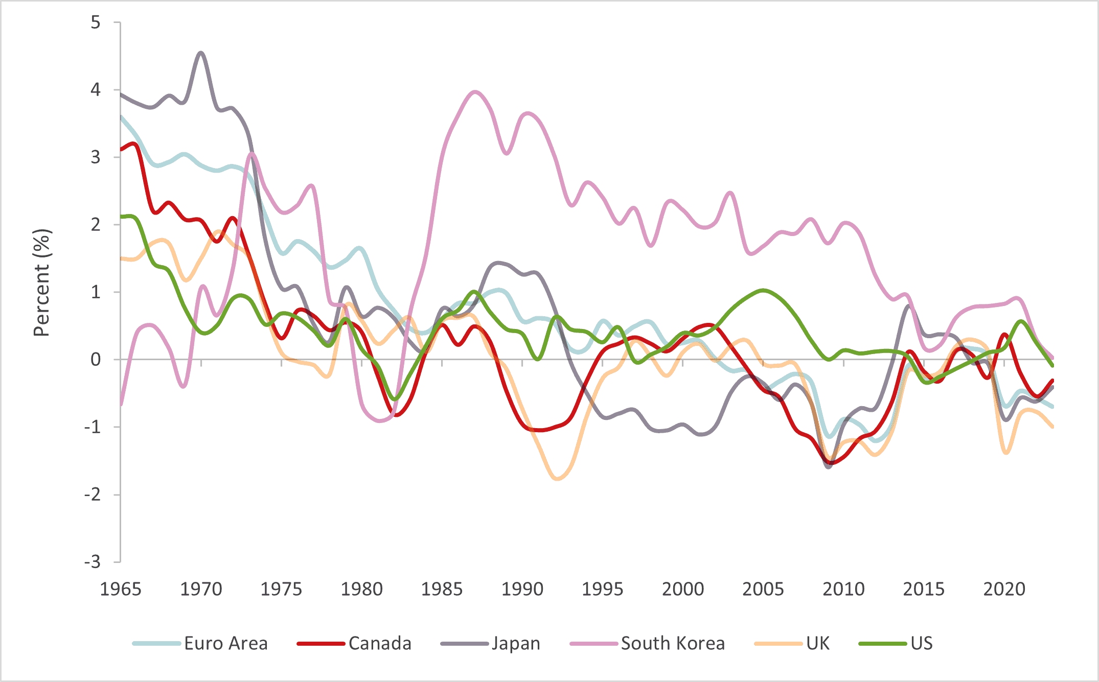 Taking a sixty-year perspective from 1965 to 2023, Figure 2 shows an almost continuous and generalised decline in TFP growth across regions. The Euro Area rate of technological progress plummeted from 2.5 pre-1980 to mostly negative levels since the Global Financial Crisis, mirroring trends in Canada, the UK, and Japan. This trend has two notable exceptions: South Korea and the US. South Korea experienced a surge in TFP growth during the 1980s fuelled by rapid industrialisation, but has since converged to the other countries’ growth rates. The US, in contrast, exhibits a more moderate decline in TFP growth, maintaining positive levels for longer periods than most other countries except South Korea.
