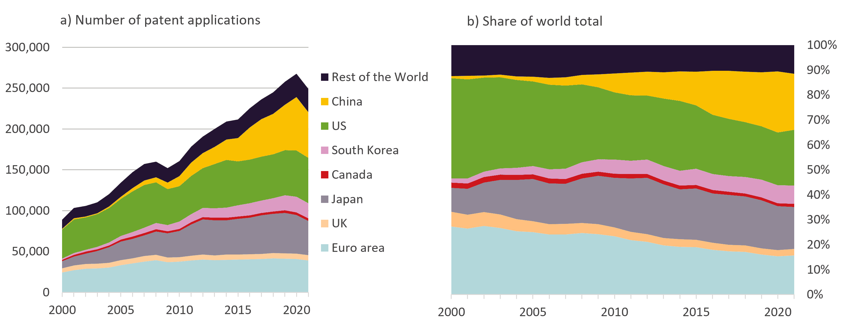 Figure 3 shows that stark decline in European innovation. Once the second-most innovative region behind the US, with 27 percent of global patent applications in 2000, the Euro Area has fallen to fourth place by 2021, holding only 15.2 percent. This gap has been filled by surging innovation in Japan (up 7.2 percentage points), Korea (up 5.8 percentage points), and particularly China (up 21.7 percentage points). Though not all patents have equal quality and Europe still has excellent research centres, the ability of firms to issue patents determines their ability to compete in global markets and remain profitable. Losing ground in terms of innovation output means a future economic landscape that contains fewer relevant European firms and products.