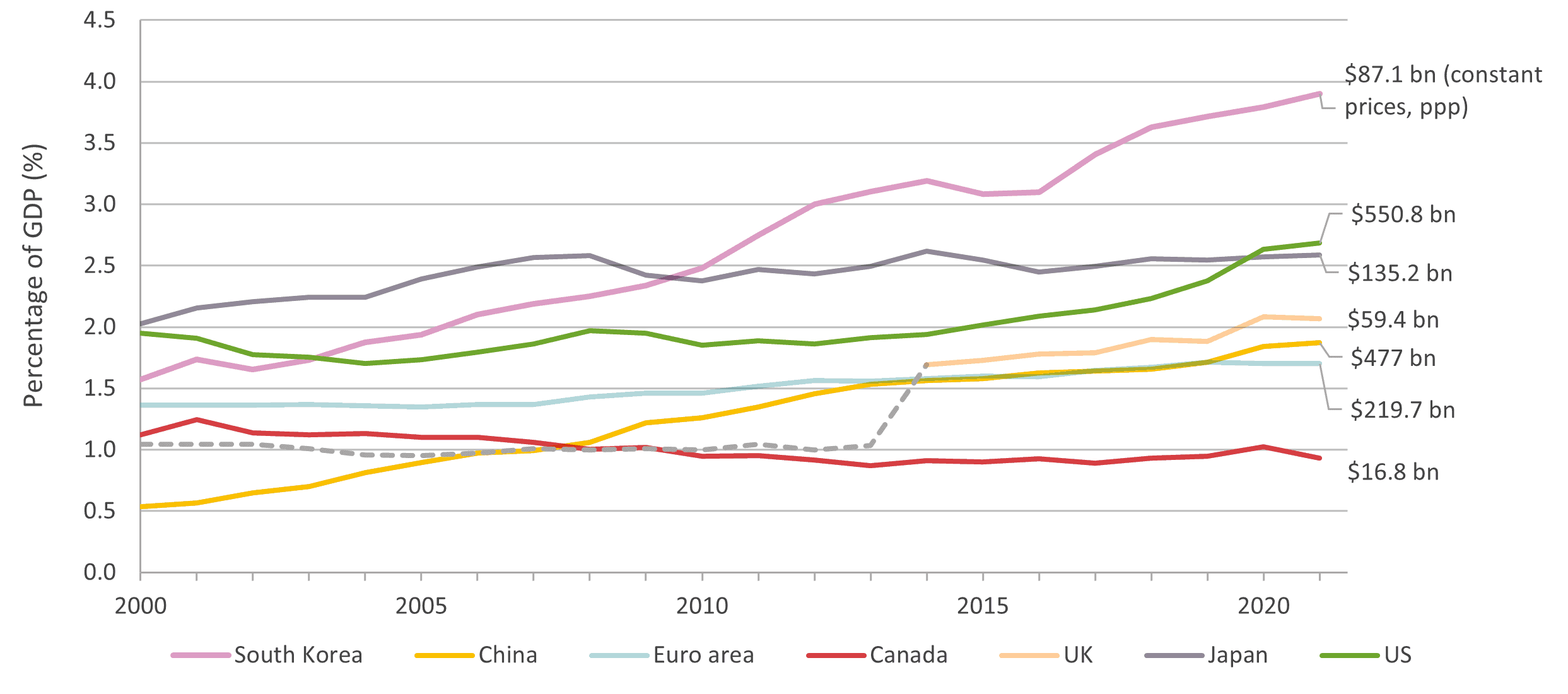Source: OECD-MSTI. Note: Due to data availability issues, the euro area does not include Malta, Cyprus, and Croatia. Data for the UK prior to 2014 is indicative due to a methodological break.
