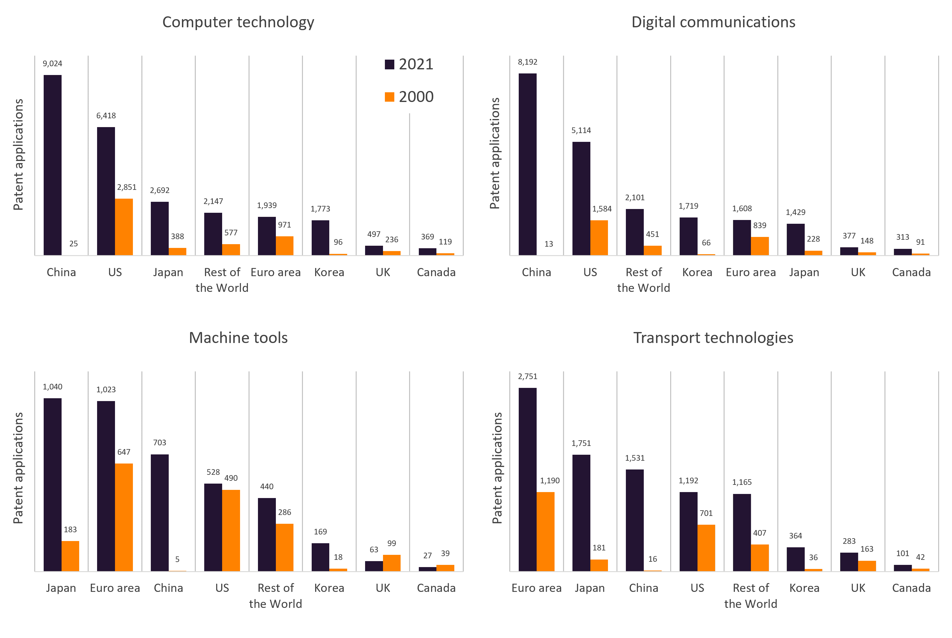 This trend is evident in Figure 5, which shows patent applications across four technologies between 2000 and 2021. While the EU remains a leader in traditional sectors like machine tools and transportation, it lags behind the US, China, Japan, and Korea in computers and digital communication technologies. This is a significant reversal from two decades ago, when the Euro Area held the second-place spot for these very technologies.