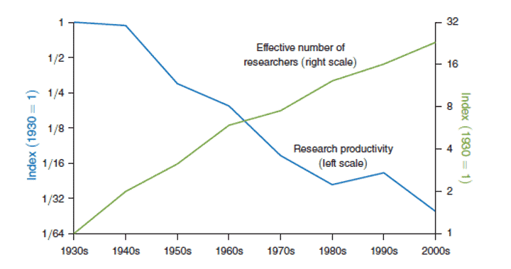 Moreover, as technological and innovation competition is growing, there is a risk that too many firms and sectors in the European economy cannot keep up pace with other advanced economies in the world. New innovation requires more labour – and this is why the cost of ideas has gone up in the economy. A group of economists calculated last year that it requires 18 times more researchers now compared with 1970 to double computer chip capacity every second year (Moore’s law). The number of researchers have gone up, but research productivity has gone down quite substantially over time (see chart 1). A growing shortage of high-skilled labour will choke innovation growth even more.