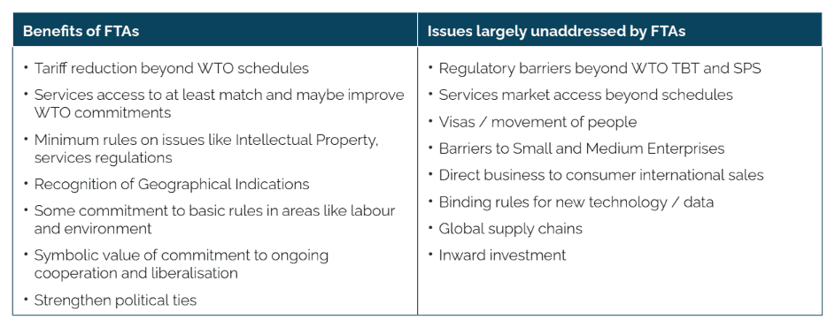 Essentially, while FTAs have importance, they no longer tackle the greatest modern barriers to trade. This is one reason for a common perception that Australia and New Zealand FTAs were unbalanced in almost completely removing UK agricultural tariffs[6] while offering little new to UK exporters in return. Lower import costs are a trade policy benefit, and time will tell if the risk in particular to Welsh and Scottish lamb production is realised, but the risk comes more from a narrative suggesting UK desperation to gain FTAs as a Brexit benefit regardless of the particular content.