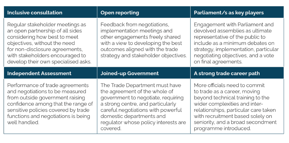 Delivering with professionalism, above all pursuing the complex choices of UK trade policy in a true partnership with all relevant stakeholders including business, consumers, NGOs, parliament, and devolved governments. The UK should be gradually deepening expertise of all of those involved, discussing the rationale for inevitable choices in a way that strengthens the quality of decisions, and treating implementation of existing arrangements as important as delivering new ones.