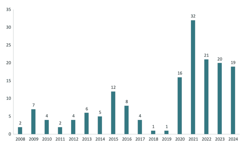 Figure 2: Number of collective action lawsuits in the Netherlands (2008-2024)Source: ECIPE’s database of collective action lawsuits.