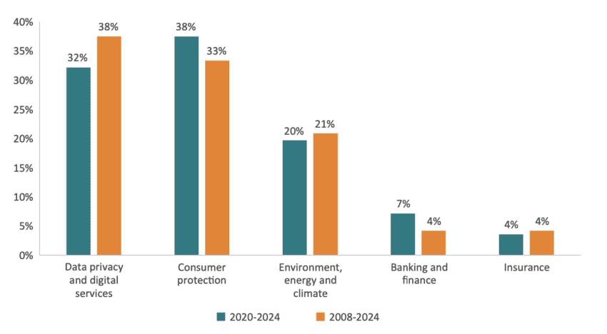 Figure 3 presents the breakdown of cases across broad economic categories. Between 2008 and 2024, consumer protection was the sector with the highest number of collective action lawsuits. However, the data also reveals that privacy and digital services became the sectors with the most cases in the period from 2020 to 2024. This finding reinforces the trend described earlier, where a significant number of collective actions in the Netherlands involve digital companies and data.
