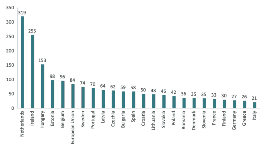 Figure 6: Inward Foreign Direct Investment (FDI) stock as percentage of GDP (2023)Source: ECIPE’s calculations based on Eurostat. Note: Luxembourg and Cyprus are outliers, with inward FDI stocks representing 3,269 percent and 1,555 percent of their respective GDPs. No data available for Malta and Austria.