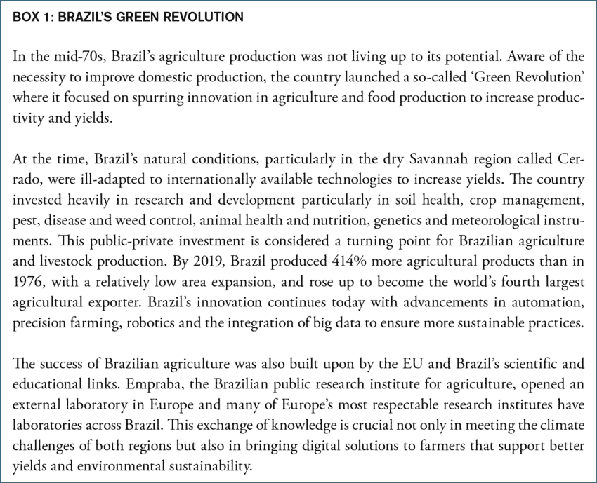 These cultural links not only lead to business opportunities but also to cross-border exchanges in higher education and science that will be given further impetus by projects like EllaLink (See Box 2: EllaLink). Many young professionals from Mercosur move to the EU searching for the next step in their professional ladder or to enhance their academic pursuits. For instance, the IE and IESE Business schools – which rank at the top of several world rankings for business schools – have 20% and 59%[10] of their respective foreign students coming from Latin America. The research exchanges between Mercosur and the EU are intense especially in terms of collaborations on science, technology, and innovation. Since 2004, EU and Brazil have been signees to the Science and Technology cooperation agreement which focuses on priority areas such as ICT, health, and renewable energy[11]. Under the EU’s Horizon 2020 initiative, EU has funded 291 projects involving Brazil, 199 with Argentina, and 35 in Uruguay[12]. There also exists strong collaboration between several EU member states and the Mercosur countries on agricultural innovation and research to monitor and promote scientific advances of interest to agricultural businesses[13] (See Box 1: Brazil’s Green Revolution).