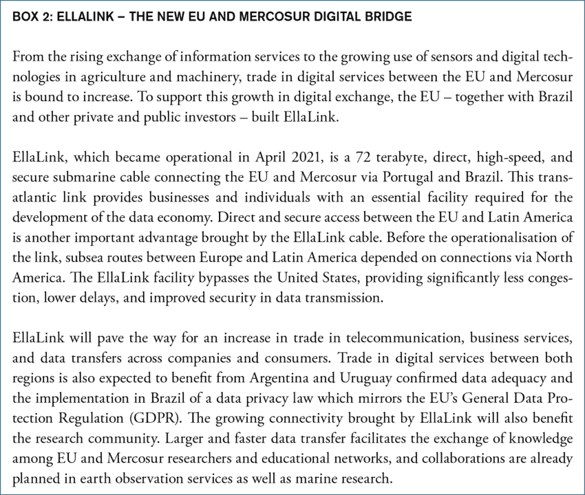 These legal and institutional similarities, as well as the strong economic links, have led to Mercosur countries adopting EU legislation and standards by their own accord. The Brussels Effect – as popularised by Anu Bradford[14] – can be seen in the regulation of the beef industry in Brazil, which includes a system of animal traceability that enables Brazilian’s exporters to provide the necessary sanitary and phytosanitary certification required by the EU, as well as in the data protection legislation developed in Brazil, Argentina, and Uruguay out of which Argentina and Uruguay already received EU data adequacy, while the Brazilian legislation is very similar to the EU GDPR[15] (See Box 2: EllaLink).