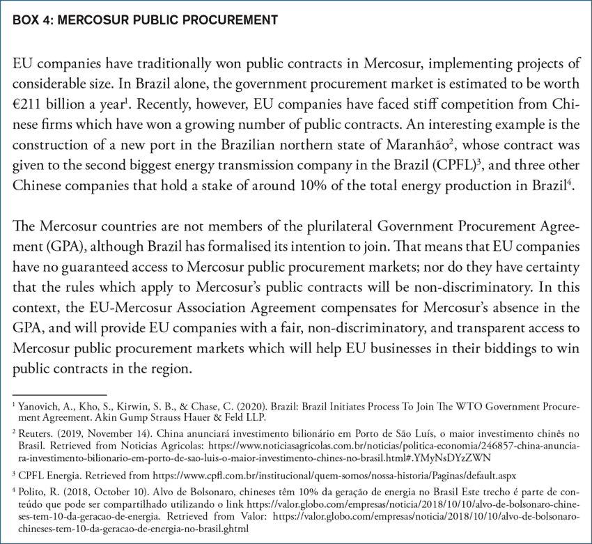 However, the EU-Mercosur investment relationship has been overshadowed by the rise of China as both a big investor into Mercosur and a destination for Mercosur investment. As Mercosur and China benefit from mutual exchanges, their economies have become increasingly interconnected, and investments have naturally followed on the heels of the trade growth (See Box 4: Mercosur Public Procurement). Chinese investment in Mercosur includes infrastructure projects such as rail networks connecting Brazil’s mining heartland with the Barcarena port in the State of Pará in Brazil to facilitate the exports of iron and other natural resources[10]. Meanwhile, Brazilian investment in China has also been on the rise: outside of the Americas, China is the only country to receive more than €1 billion in investment between 2015 and 2020 from Brazil[11]. This includes companies like Embraer, a Brazilian plane manufacturing company, which is exploring an expansion into the Chinese market to meet the rising regional demand[12].