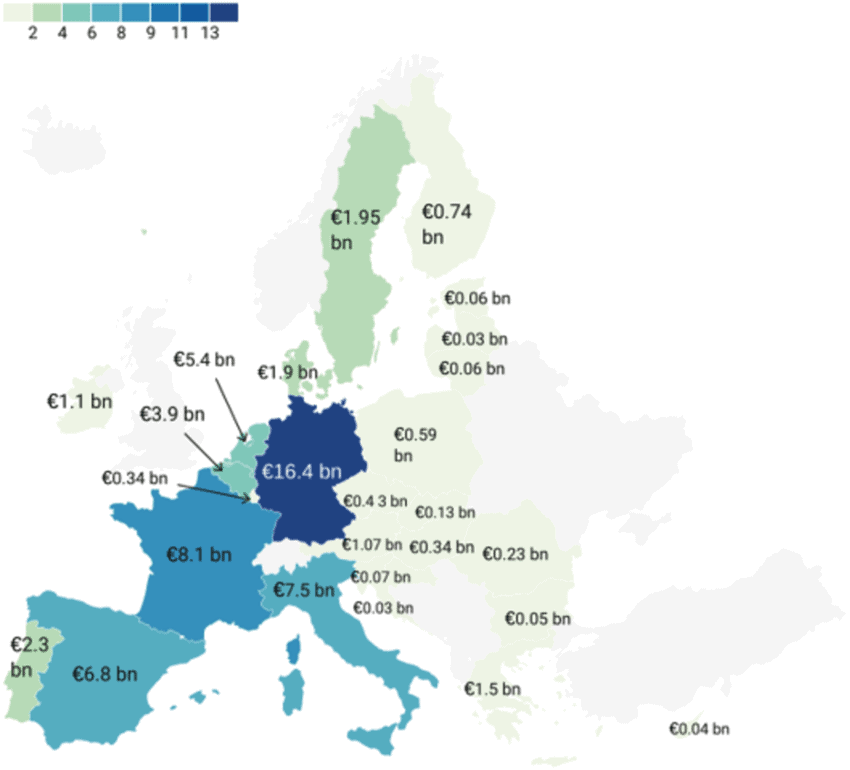 Figure 2: EU exports of goods and services to Mercosur by EU member states in 2019 (Euro, billion)