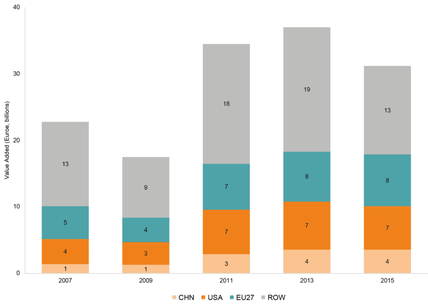 For Mercosur countries, EU businesses are the largest foreign contributors to Mercosur (Brazil and Argentina) exports. In 2015, EU value-added in Mercosur exports reached €8 billion. Over the past nine years, starting from 2007, EU value-added in Mercosur exports almost doubled (see Figure 4). To put this value in context, while 90% of the value of Mercosur exports comes from Mercosur’s own domestic production, EU value-added in Mercosur’s export represents one of every four euros contributed by non-Mercosur companies to Mercosur’s exports. At the same time, Chinese value added into Mercosur exports tripled over the same period.