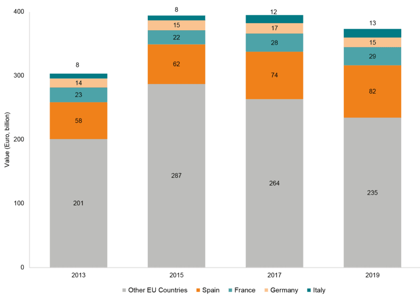 As with EU trade with Mercosur, EU FDI into Mercosur is comprised by investments from numerous EU member states. Between 2013 and 2019, companies based in 22 EU member states made investments in the Mercosur countries. The top EU member states investing in Mercosur were Netherlands (€1.3 trillion), Spain (€0.5 trillion), Luxembourg (€0.4 trillion), France (€0.2 trillion), and Germany (€0.1 trillion)[2]. As can be seen in Figure 5, EU member states – other than Spain, France, Germany, and Italy – represent 60% of the €2.6 trillion that the EU invested in Mercosur between 2013 and 2019. This demonstrates that EU FDI into Mercosur involves companies from across the EU and not just from the larger economies.