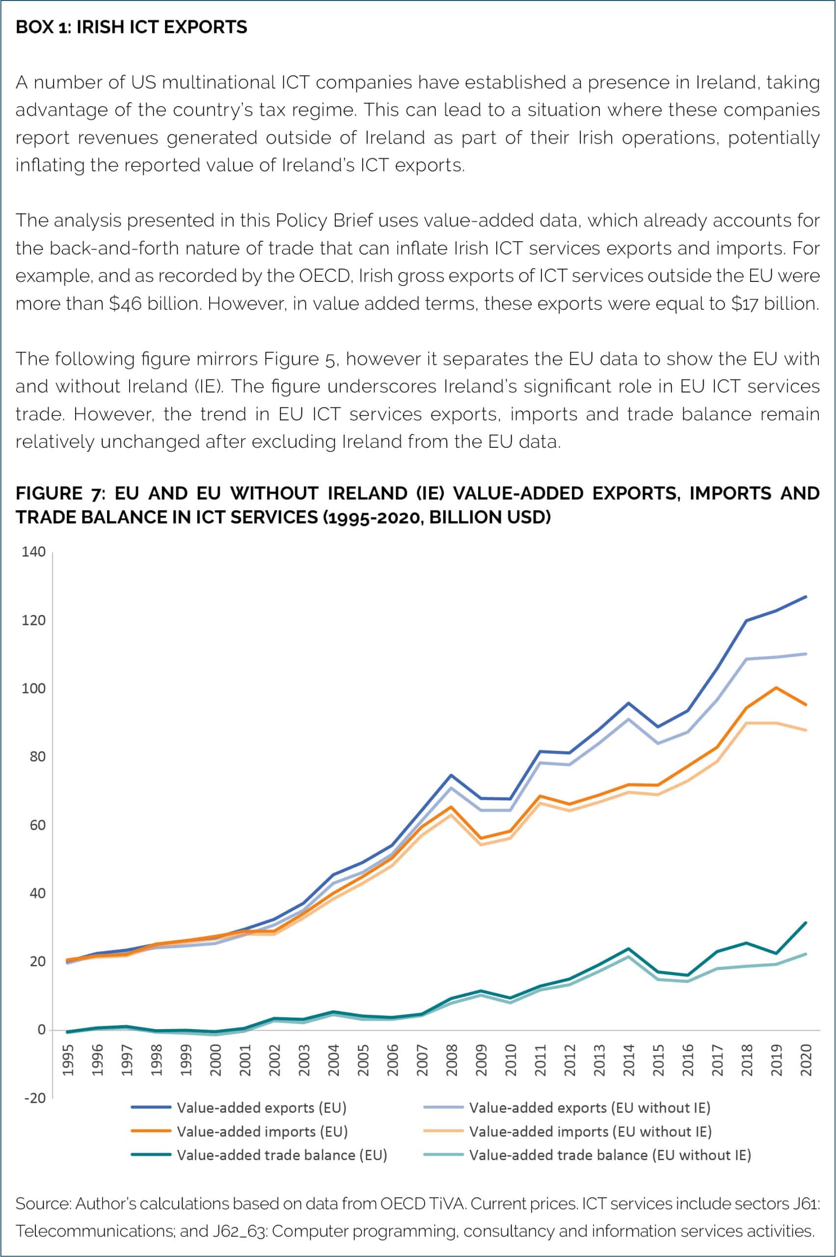 Four EU member states – Germany, Ireland, France, and the Netherlands – collectively account for more than half of the EU’s value-added exports in ICT services. Despite this concentration, a positive trade balance in ICT value-added trade is a common feature for most EU countries. The Netherlands, Germany, and Ireland boast the highest surpluses, at $4.6 billion, $8.7 billion, and $9.2 billion, respectively, while Austria, Denmark, France, Greece and Slovenia present trade deficits. It is worth noting that Ireland’s case is unique due to the presence of a significant number of large US ICT companies headquartered there. However, even excluding Ireland’s data, the EU maintains a substantial ICT services trade surplus of $22 billion (See Box 1).
