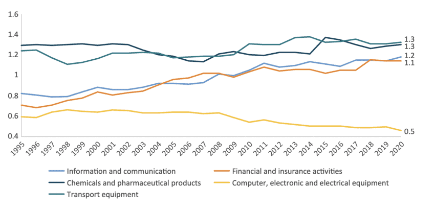 EU’s Revealed Comparative Advantage (RCA)[1] for a selection of sectors. This index, which assesses a country’s export performance relative to the global average, provides a measure of competitive strength. The figure reveals that EU services such as the ICT sector and the financial and insurance sector have moved from a position of comparative disadvantage to one of comparative advantage.