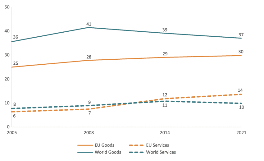 Figure 2: World and EU trade openness in goods and services (2005-2021)Source: Author’s calculations based on data from Eurostat, WTO and IMF.