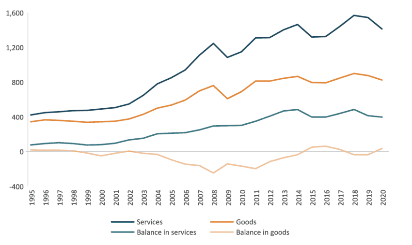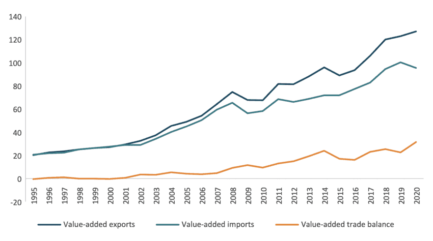 Figure 3: EU value-added exports and trade balance in goods and services (1995-2020, billion USD)Source: Author’s calculations based on data from OECD TiVA. Current prices.