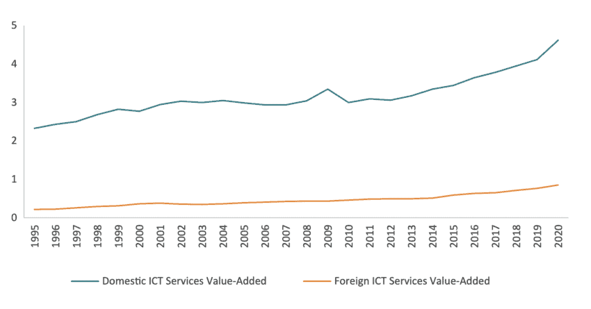 Figure 8: Share of domestic and foreign ICT services value-added in EU gross exports (1995-2020, %)Source: own elaboration from TiVA database