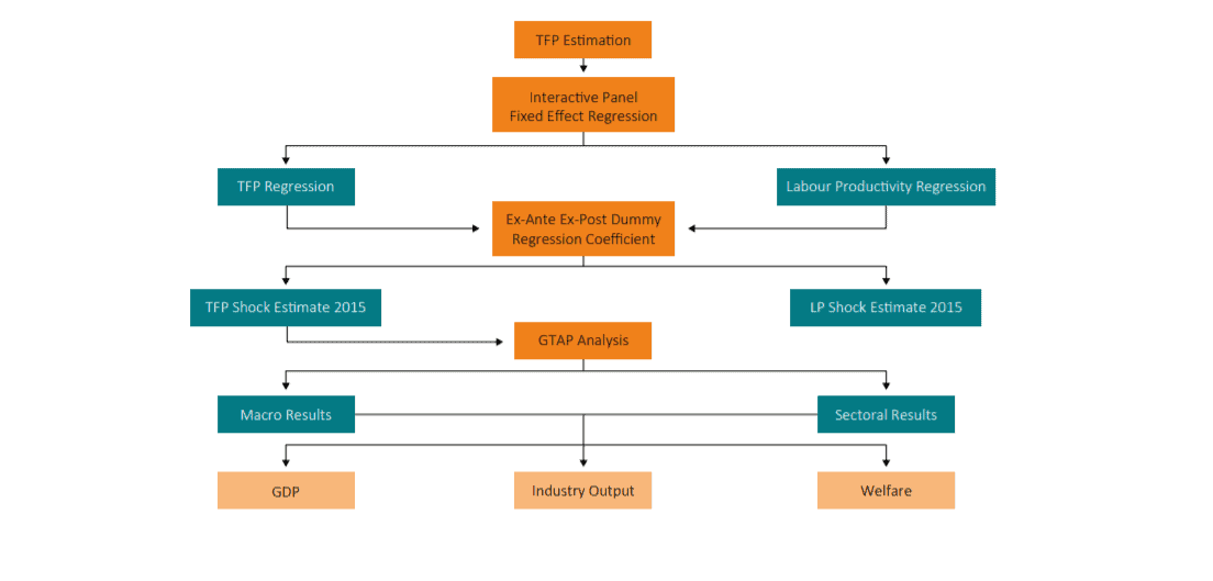 The main focus is on the coefficient of the specific policy dummy variable and the particular regression interactive terms defined as the product of the explanatory variables and the policy regulation dummy.[3] The purpose of the regression is to observe the shocks in total factor productivity and labour productivity. The shock estimates are derived for each country in 2015 using the coefficients of the regulation dummy variable (labelled as ex ante or ex post), TFP and labour productivity.