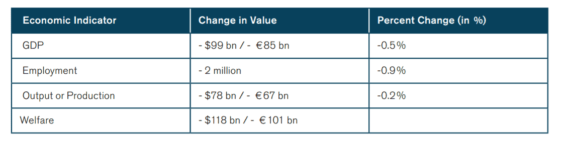 At least 0.90% drop in employment is expected (the model assumes skilled labour is fixed, while unskilled is not). This loss describes the estimated negative impact of the regulation on the overall employment of the EU due to loss in productivity, coming from the losses in sectors’ output that reduce demand for unskilled labour in particular.