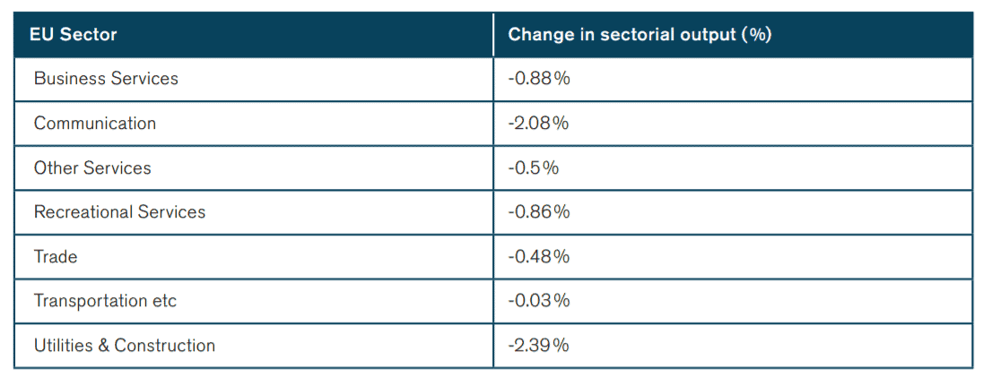 A sectoral examination of the industrial output, focusing on selected sectors that are affected, as a result of the shock gives us a broader perspective of the losses- European Union has recorded a negative impact in all the four sectors of focus- wholesale and retail trade, communication, other business services and recreational sector. Communication sector is the worst affected in percentage terms. Some sectors not shown in this table (e.g. textiles and apparel, manufacturing and utilities) may gain slightly due to the displacement and reallocation of some of the resources, such as capital and skilled labour, from the ex ante affected sectors. Such effects are common in CGE models, and the overall economy-wide impact is negative.