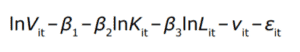 where V, K, L are the total production, capital and labour used. v is the productivity and wage component used in evaluation along with the final error term, which is uncorrelated with all the input variables. i refers to the sector and t denotes the year for each country.