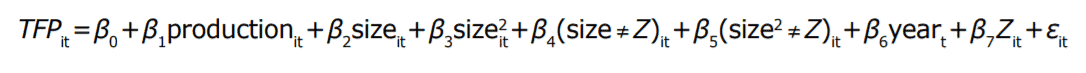The explanatory variables chosen here are based on the vast literature on determinants of TFP (e.g. Iyer, 2013; Kim and Loayza, 2017; Loko and Diouf, 2009), which typically considers micro-level size, which is proxied in our context by the turnover per employee. In addition, we also capture the macro-level agglomeration effects proxied by total production; several macro TFP studies use GDP as a proxy in this context. If overall production is high for a given sector and country, it is likely that it may be more productive, because of its large presence – which indicates learning, experience and efficient supply chains.