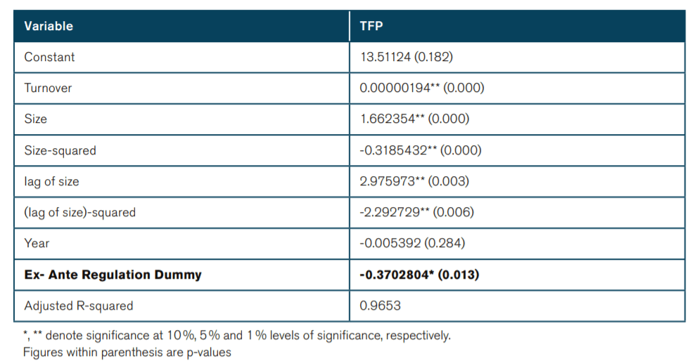Hence, we conclude that there is a negative impact due to the ex ante regulation on TFP but not on labour productivity in the EU for the sectors where regulatory approach changed from ex post to ex ante.
