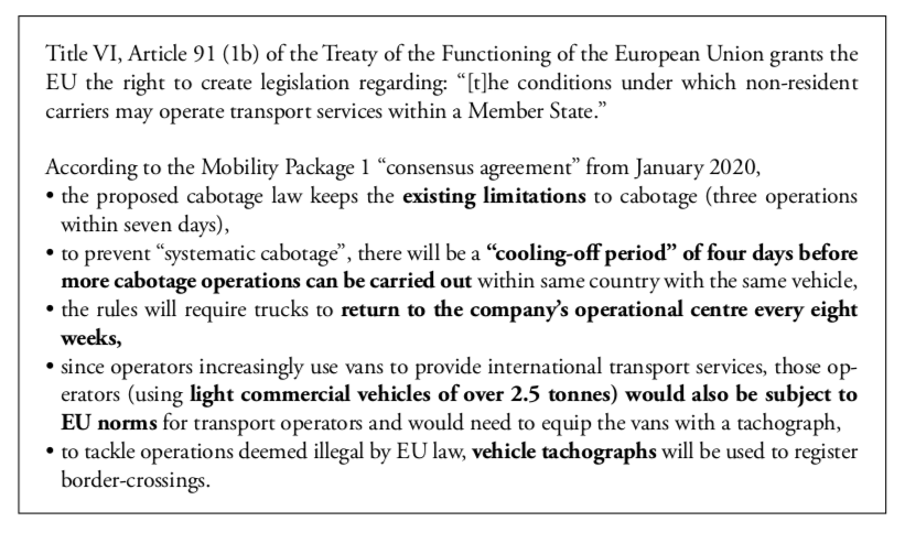 According to the latest proposals of the Mobility Package 1, the freedom to provide freight transport services across EU borders is restricted by three types of legal obligations: the obligation to leave a Member State after the provision of a limited number of cabotage operations, a new return-to-home policy that in effect reduces the number of monthly cabotage operations and a mandatory “cooling off” period explicitly intended to further restrict the freedom to provide cabotage services (see Box 1).[4]