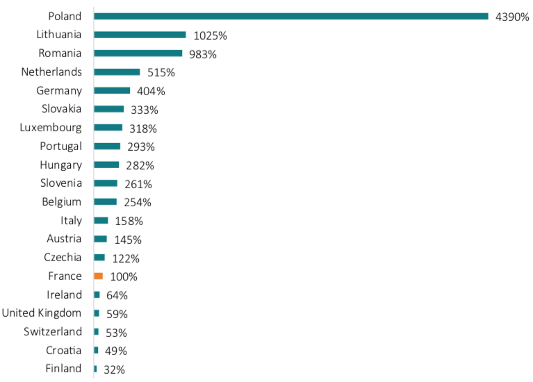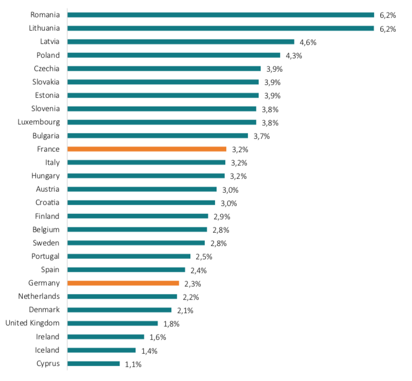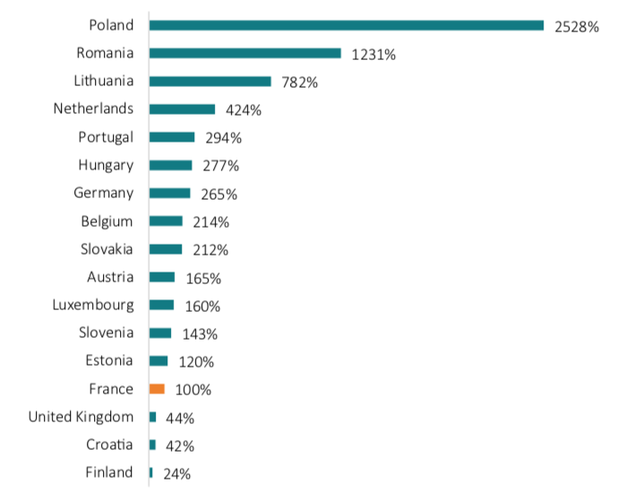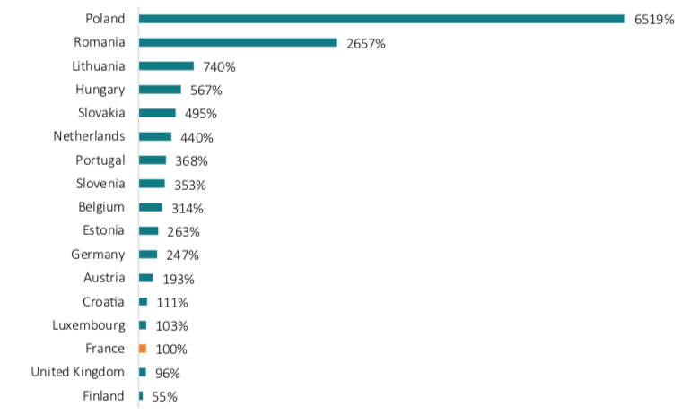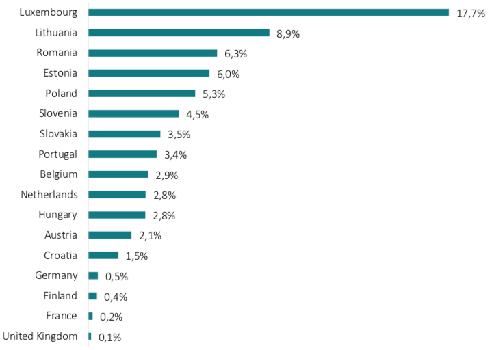 Figure 7. Estimated number of enterprises potentially affected by EU cabotage regulations, total road freight transport services, in % of estimated number of French companies conducting cabotage operations in the EU, 2017 Source: Eurostat. Calculations based on the total number of companies operating in road transport services by country multiplied by the country’s overall share of loaded international cabotage services in total loaded international freight transport.
