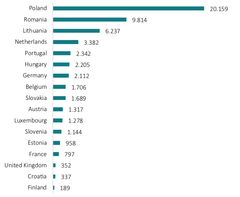 Figure 9. Number of employees potentially affected by EU cabotage regulations, total land transport servicesSource: Eurostat. Calculations based on share of loaded international cabotage services in total loaded international freight transport and total number of employees in NACE sector H49 “land transport and transport via pipelines”, number of employees by domestic concept. Note: for some countries, 2018 data were not available for land transport services employment. 2017 values for land transport services employment were applied for Germany, Portugal, Sweden, Italy, France, Latvia, Bulgaria and Romania.