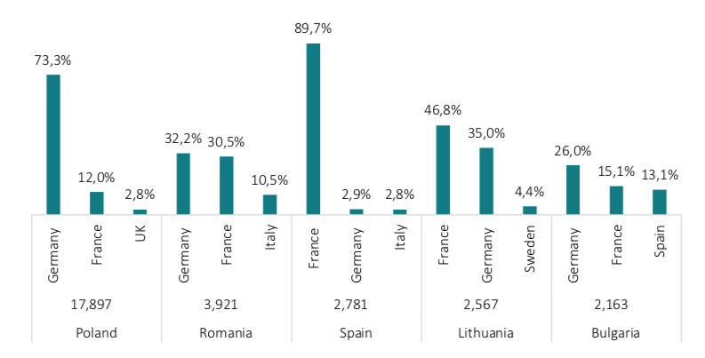 Based on the share of international cabotage services in total international freight transport in the EU, Figure 4 depicts the number of workers that are directly affected by cabotage restrictions and would be directly affected by cooling-off periods and return-to-home policies respectively. It illustrated that number of Polish workers (20,159), Lithuanian workers (6,237) and Romanian workers (9,814) directly affected by the regulations would be substantially higher than the number of French workers (797) similarly impacted (see also Figure 9 in the Appendix).