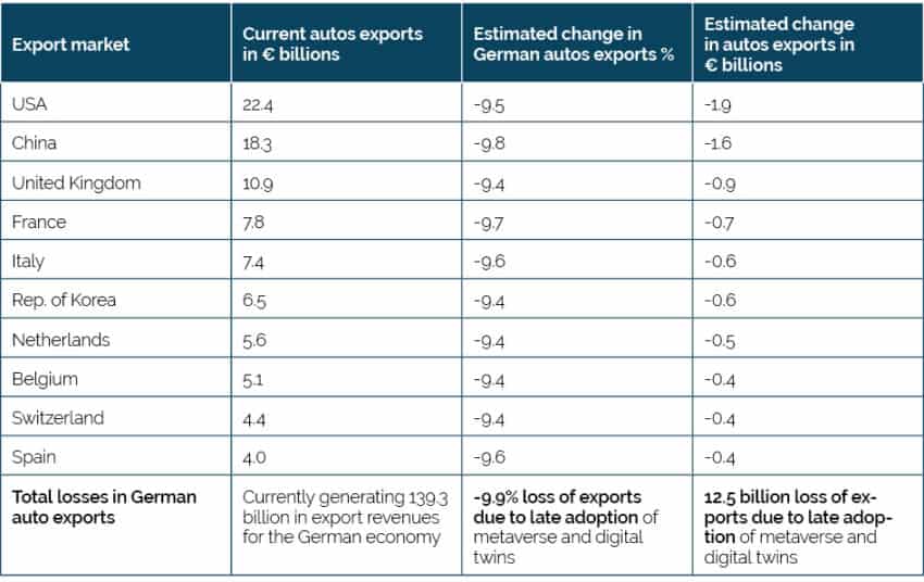 As can be observed, the hypothetical cost of delayed metaverse adoption is significant. A relative rise in the price of German autos would lead to an estimated decrease in world exports of nearly 10%. This equates to more than €12 billion each year.