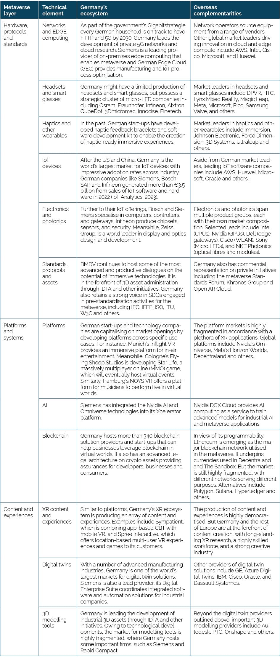 The ongoing development of technical foundations represents a commercial opportunity. This applies not only to German technology firms, but also for other businesses to develop their own use-cases economy wide. Table 2 provides a stocktake on the current health of Germany’s metaverse ecosystem. It also highlights important commercial partnerships as adoption rates continue to grow.