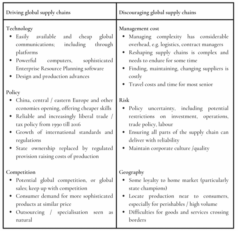 Yet companies also face constraints in their choices. Complexity in operation is likely to increase risk. This is why governments seeking to attract companies have sought to offer reassurances, not always successfully, against domestic policy change. The drivers around global supply chains are thus complex, and likely to remain so.