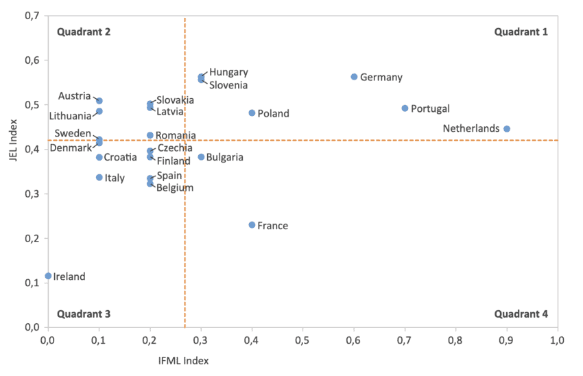 The IFML and JEL indices can be combined to position each EU country within a quadrant framework based on their scores. The following figure illustrates EU countries positioned above or below the IFML and JEL averages.