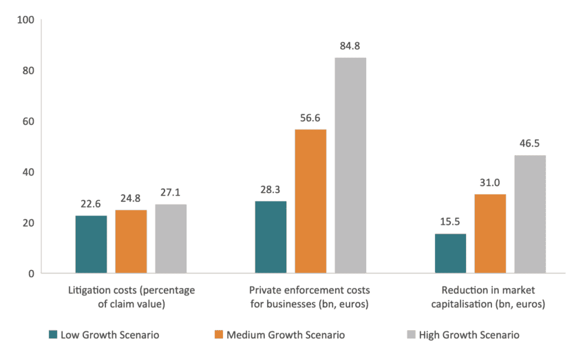 Several studies have sought to estimate the costs of private enforcement on companies operating in the US. These estimates serve as the basis for assessing the potential impact of a higher volume of collective actions in the EU. However, it remains uncertain how closely the EU system of mass litigation aligns with its US counterpart. To address this uncertainty, a scenario-based analysis has been employed to capture a range of potential outcomes. The study outlines three scenarios (Low, Medium, and High Growth) which assume that as the number of collective actions in the EU rises, the economic effects of mass litigation observed in US empirical studies can be proportionally applied to the EU economy.
