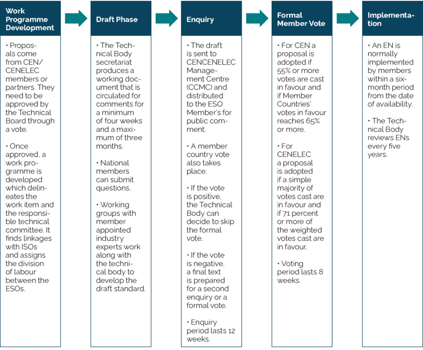 CEN and CENELEC share a similar governance structure and decision-making system. The first step in the process to adopt a European standard (EN) is to identify a new work item. Proposals for new work items can come from business, industry, and other stakeholders via CEN and CENELEC members, partners, and liaison organisations. Approximately 30 percent of CEN/CENELEC standards are developed in response to the European Commission requests. This specific subset of ENs that ensures products and services comply with EU regulation is referred to as Harmonised Standards (HS). Proposals for new work items are approved by the ESO’s Technical Board chaired by a President or Vice-President.