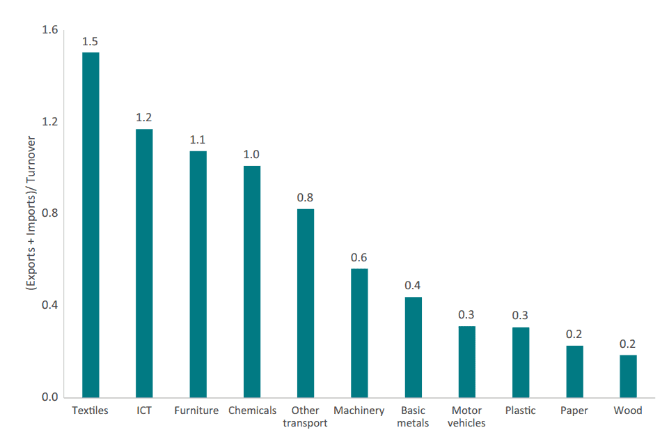 Figure 1: Exports and imports over total turnover across European economic sectors in 2019Source: Eurostat. Author’s calculations.