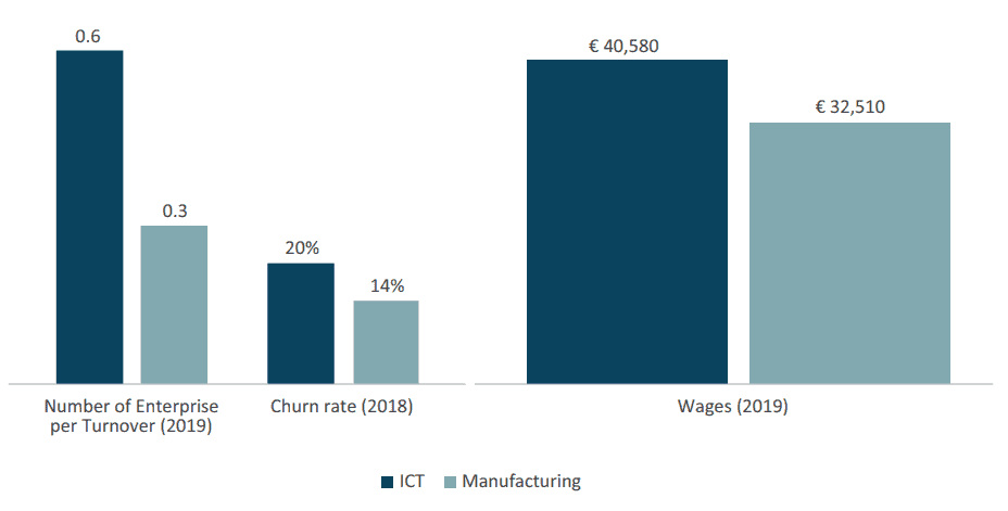 Figure 2: Number of companies over turnover, churn rates, and wages in euros for European ICT and manufacturingSource: Eurostat. Author’s calculations.