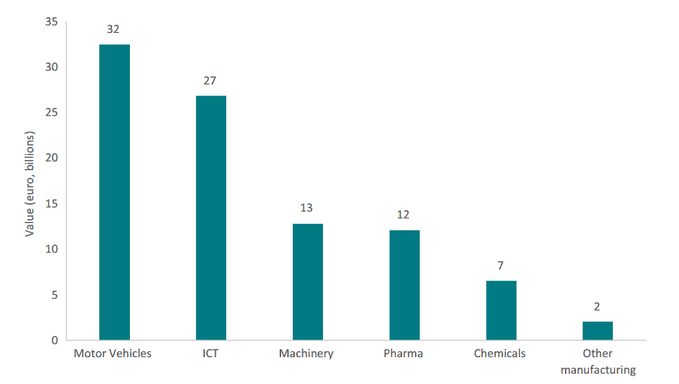Figure 4: Business spending on R&D across European economic sectors in 2019Source: Eurostat, Author’s Calculations. France, Estonia, Cyprus, Latvia, Lithuania, Luxembourg, Netherlands, Poland, Slovakia, Sweden not included due to missing data.