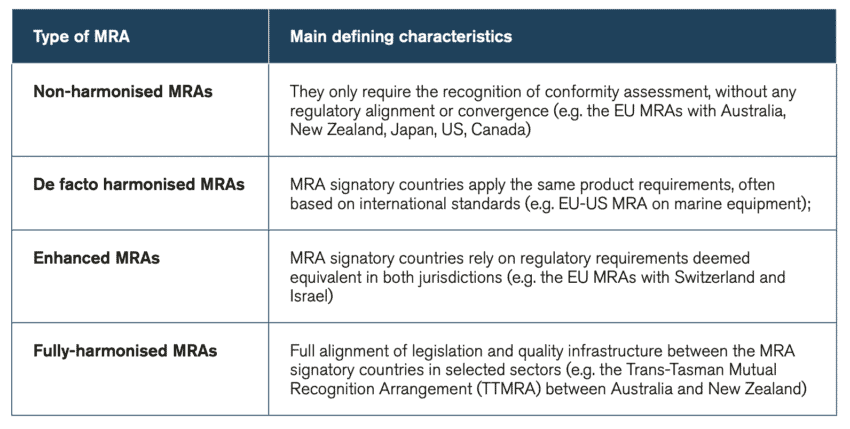 Trade policy can play a crucial role in reducing these unnecessary product certification costs, without impairing the ability of regulatory authorities to carry out their public policy responsibilities. While free trade agreements have been considered in recent years, alongside WTO rules, as the main vehicle to reduce such unnecessary trade costs linked to testing and conformity assessment procedures, they are not the only available tool for trade policy makers. One regulatory cooperation instrument used to reduce unnecessary trade costs for companies engaged in global supply chains is the so-called mutual recognition agreements (MRAs). Unlike FTAs, MRAs are relatively unknown, beyond the trade and technical experts that are involved in such specialised work. Although less known, MRAs have been used to facilitate trade among many countries, as evidenced by the comprehensive survey carried out by Correira de Brito, Kaufmann and Pelkmans (2016). Four distinct types of MRAs can be distinguished (Table 2).
