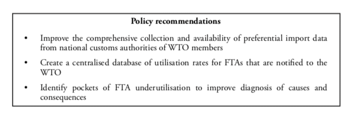 The creation of a centrally-held, WTO-driven and standardised database of utilisation data for reciprocal trade agreements would finally enable the evaluation of the impact of FTAs on businesses and the multilateral trading system. A more systematic review of how current FTAs have been implemented and are utilised would, over time, allow WTO members to learn about best practices elsewhere. This could impact prospective FTA negotiations and contribute to the WTO’s mission to achieve a more open, predictable and transparent trading system.
