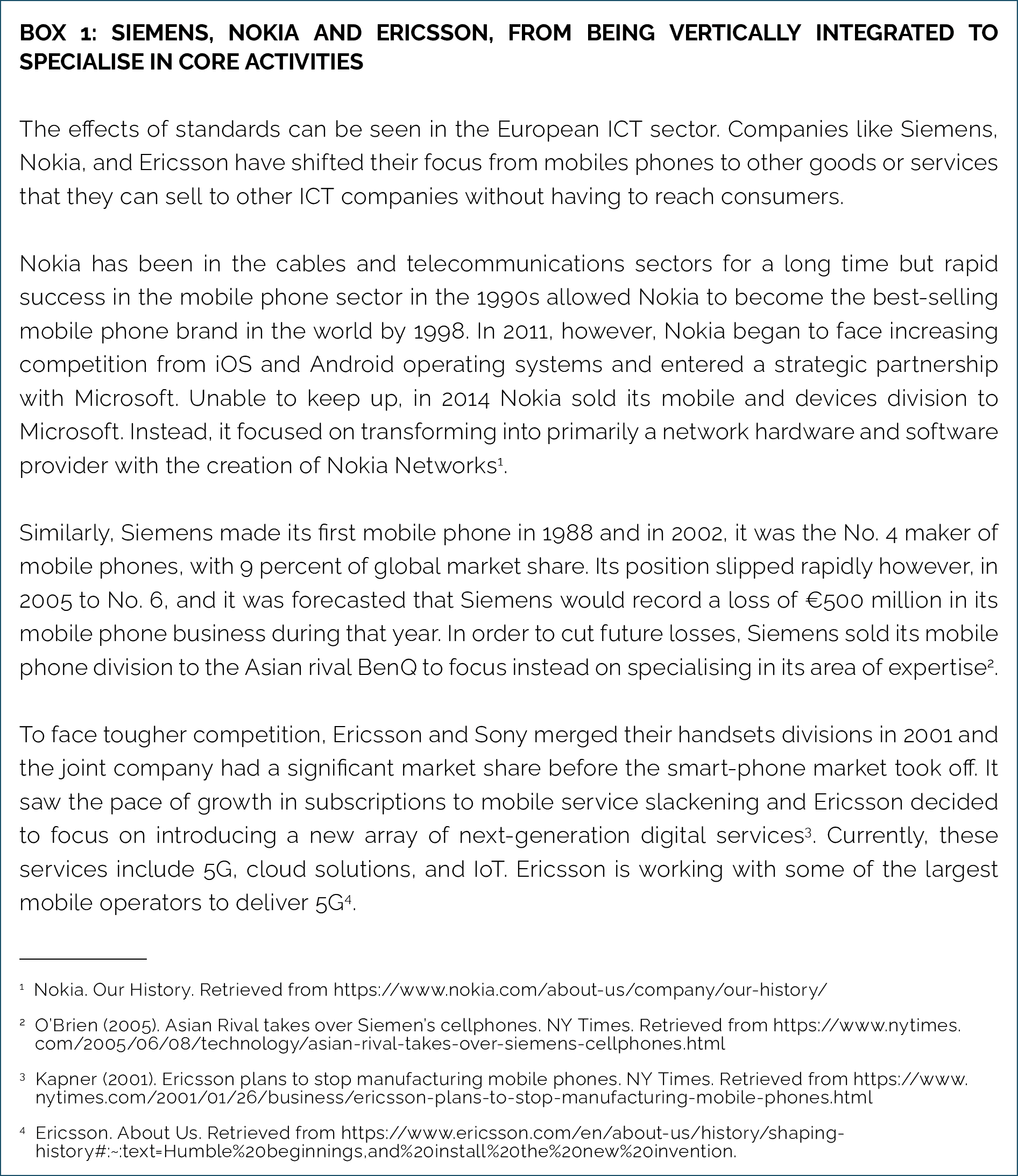 In other words, because of market developments and the SEP system, companies can work at arm’s length rather than having to integrate different activities within the firm. For instance, nowadays, it is impossible for a single firm to produce each and every component of a mobile phone. Thanks to technical standards, a producer of cellular technology does not need to master every component and a user does not need to fully control every technology inserted into its products. Moreover, producers of technology know that, if the technical standard is successful and implementers adopt it, its work will be protected and rewarded, which incentivises them to continue participating in Standard Development Organisations (SDOs).