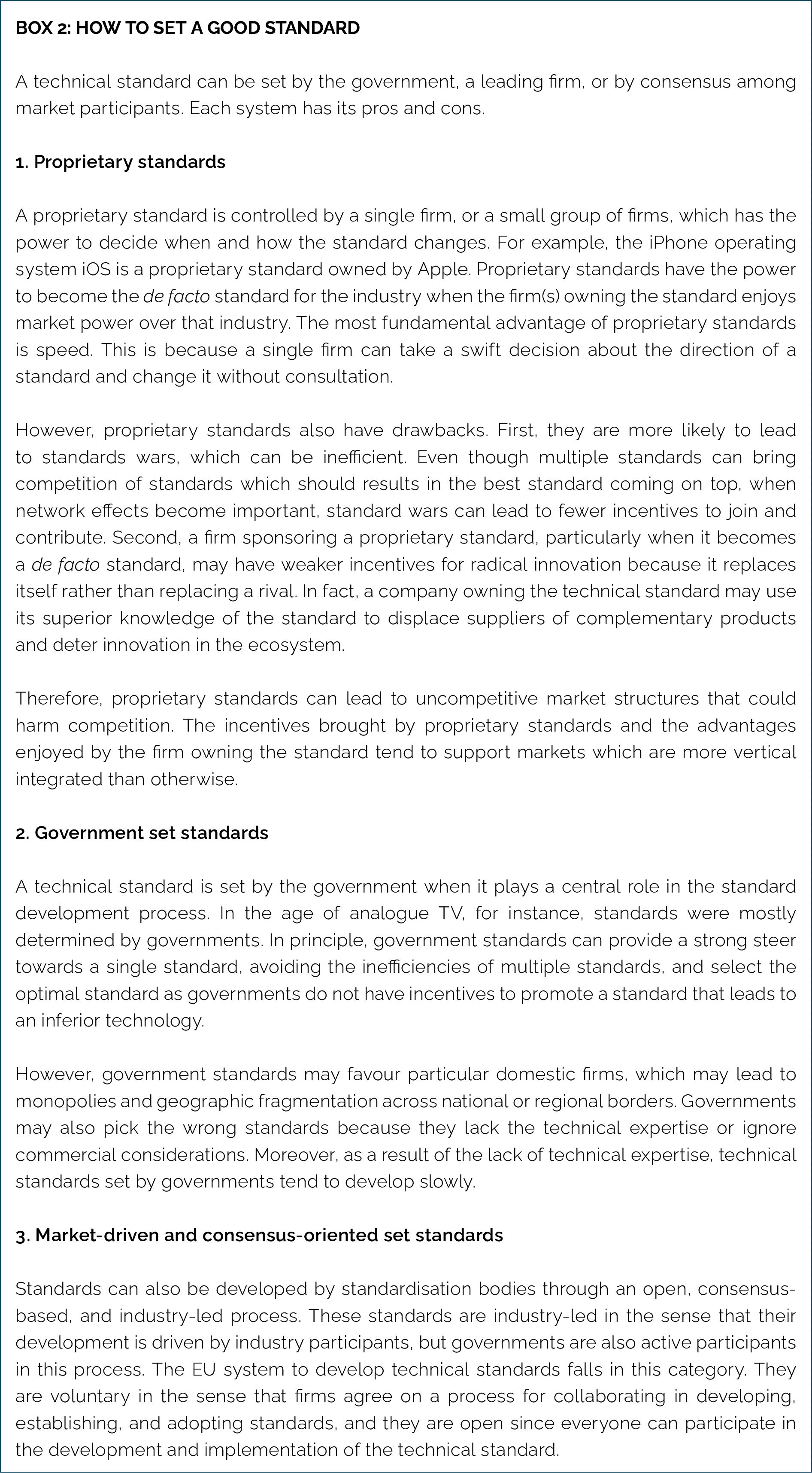 Europe has played a critical role in this development. The combination of a good culture of technical regulation and competent bodies like the European Telecommunications Standards Institute (ETSI) have made Europe a central hub for developing standards. Despite profound market change in the past 20 years, which has reduced the market importance of Europe and the role of European firms, Europe has maintained its unique role in the process of developing new standards. At the moment, Europe punches above its weight.