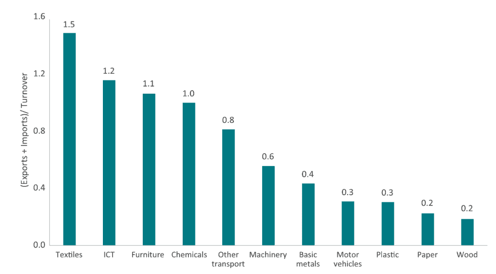 Figure 1: Exports and Imports over Total Turnover Across European Economic Sectors in 2019Source: Eurostat. Author’s calculations.
