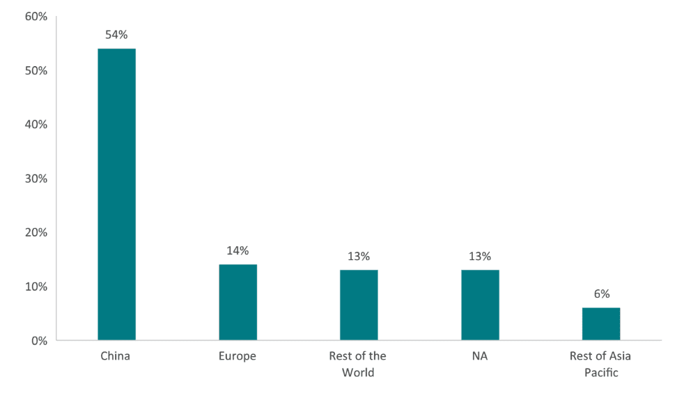 In fact, a similar argument can be made for IoT devices. It is now argued that the advent of IoT will reverse the balance of revenues, leading to more downstream income for Europe – also on the export side. This is partly true, but the argument still does not stack up. Only 14 percent of IoT modules are made by companies headquartered within Europe while 54 percent of shipments were made by companies headquartered in China (Figure 4). Even if European firms develop and innovate in the IoT space, it is still not attractive to produce in Europe and most customers will still be in the large Asia-Pacific region.