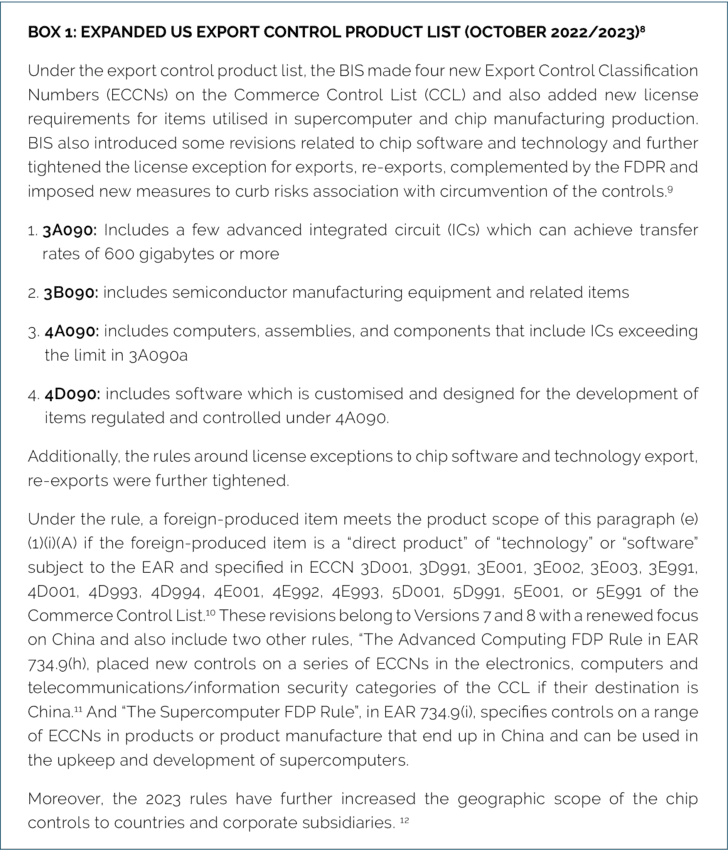 So far, EU has continued to remain passive on the export control debate. However, the state of tension between the two points to the likelihood where the US can impose its “draconian” FDPR rule to extend technology related export controls to transactions between its foreign allies and China. The rule gives the US government the power to stop a product from being sold, including products made in a foreign country if the product was made using American technology.[7] And the list of affected products has recently been expanded to also curb China’s access to advanced computing semiconductors and semiconductor manufacturing equipment (see Box 1).